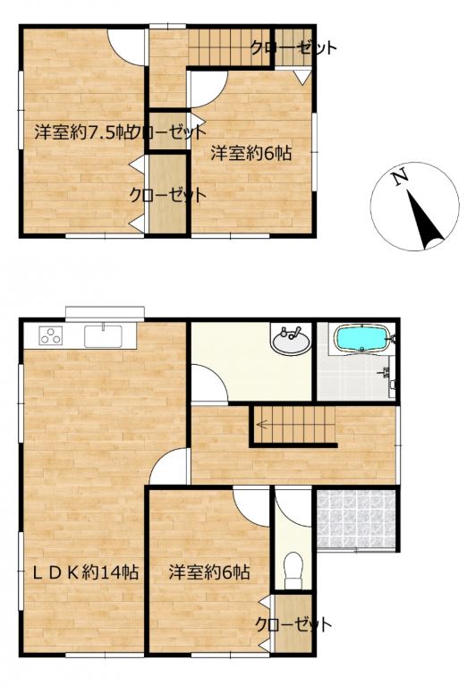 | 間取内容 | LDK 14畳 1階 1室 洋室 6畳 1階 1室 洋室 7.5畳 2階 1室 洋室 6畳 2階 1室 | ||