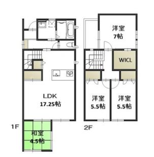 | 間取内容 | LDK 17.25畳 1階 1室 和室 4.5畳 1階 1室 洋室 7畳 2階 1室 洋室 5.5畳 2階 2室 | ||