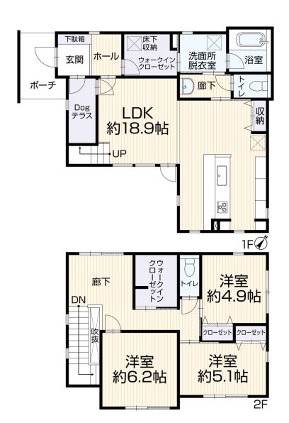| 間取内容 | LDK 18.9畳 1階 1室 洋室 6.2畳 2階 1室 洋室 5.1畳 2階 1室 洋室 4.9畳 2階 1室 | ||