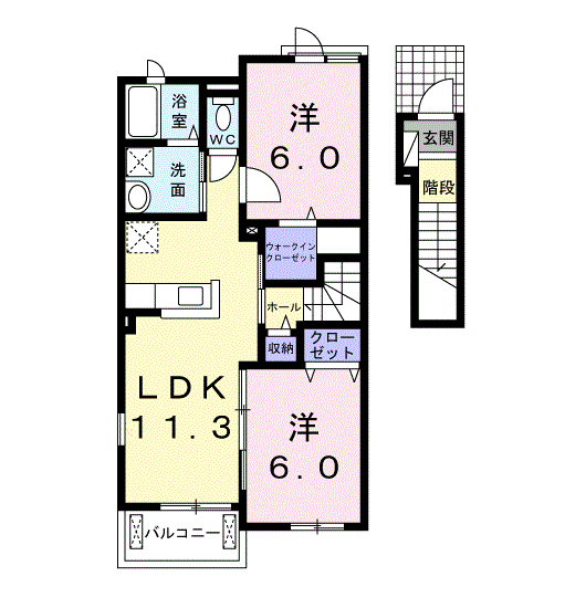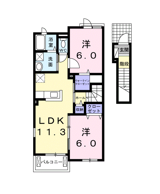 | 間取内容 | LDK 11.3畳 1室 洋室 6.0畳 2室 | ||