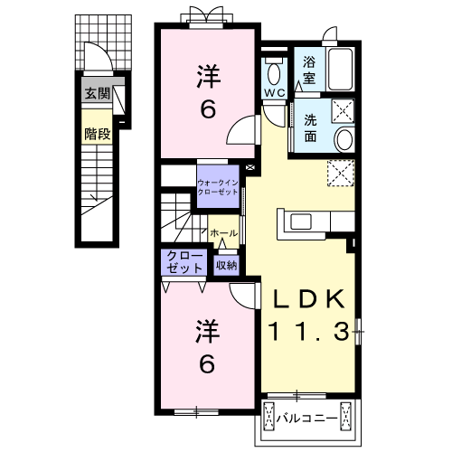 | 間取内容 | LDK 11.3畳 1室 洋室 6畳 2室 | ||