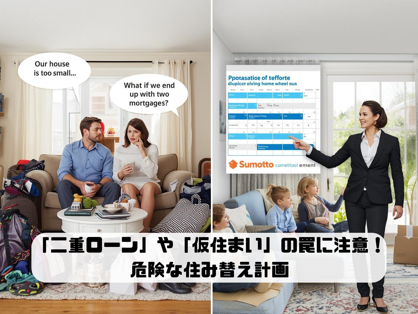 【買い先行の罠:恐怖の二重ローン】 「とりあえず新しい家を買おう!」と先に契約してしまうと、もし今の家が希望の期間内に売れなかった場合、「今の家のローン」と「新しい家のローン」を同時に支払う【二重ローン】の地獄に陥ります。焦って今の家を相場より数百万円も安く叩き売る羽目になるケースが後を絶ちません。