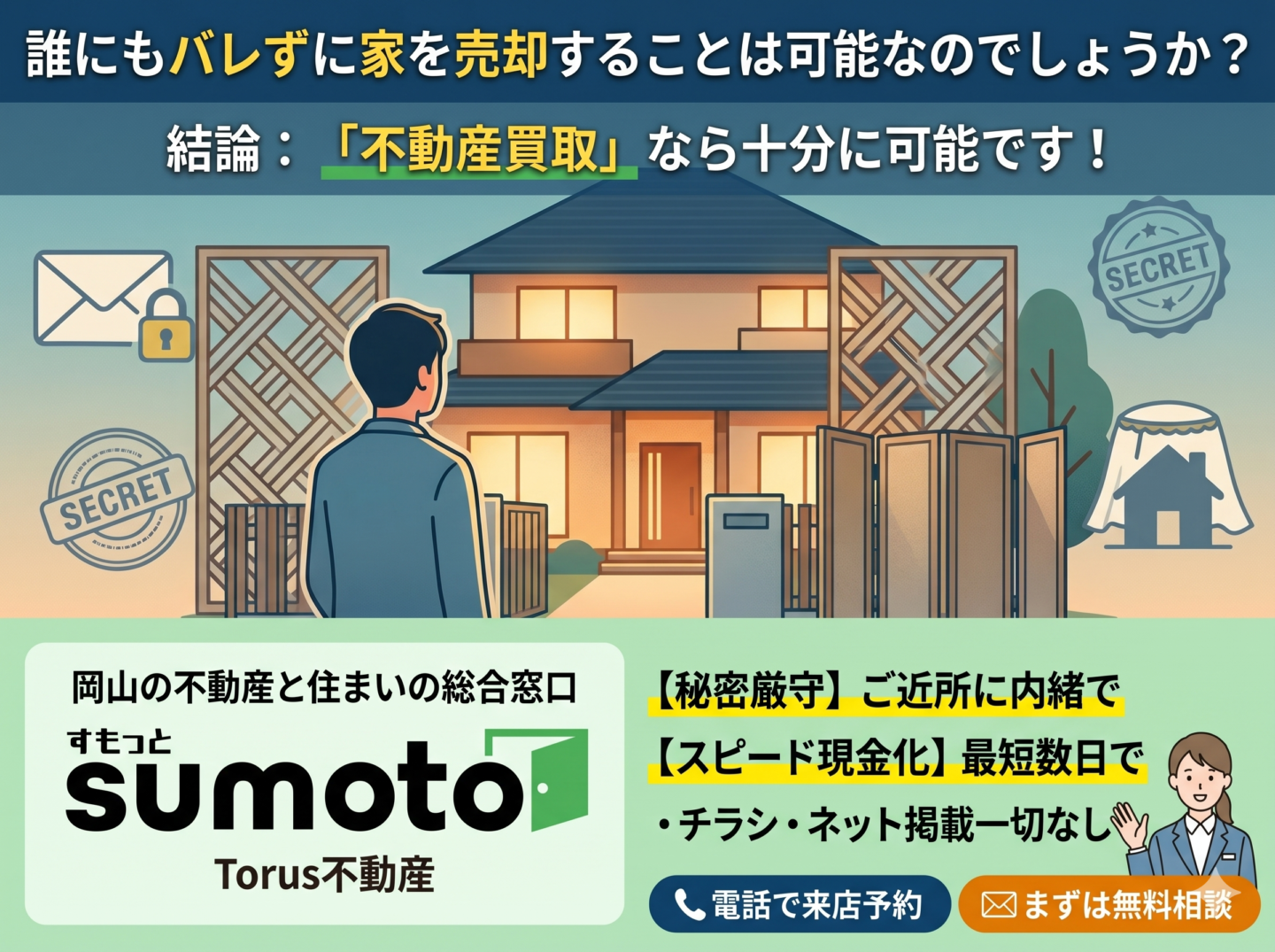 結論から申し上げますと、「ご近所に一切知られずに家を売却することは十分に可能」です。 今回は、岡山の不動産と住まいの総合窓口「すもっと(Torus不動産)」の現場スタッフが、周囲にバレずに不動産を売却するための具体的な方法と、不動産業界の「不都合な真実(デメリット)」を包み隠さず正直にお話しします。